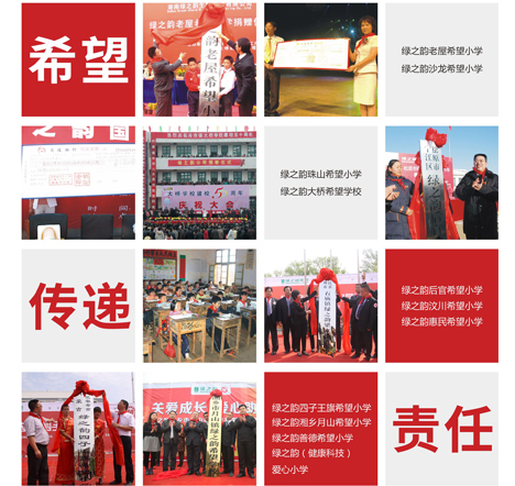 【具體內(nèi)容】:捐助38所綠之韻希望學(xué)校是所有綠之韻人的夙愿。全國各地已先后有綠之韻沙龍希望小學(xué)、綠之韻珠山希望小學(xué)、綠之韻大橋希望學(xué)校、綠之韻后官希望小學(xué)誕生、綠之韻汶川希望小學(xué)、綠之韻惠民希望小學(xué)、綠之韻四子王旗希望小學(xué)、綠之韻湘鄉(xiāng)月山希望學(xué)校、綠之韻(健康科技)涼山愛心小學(xué)等。2014年11月25日,綠之韻集團(tuán)獲共青團(tuán)中央、中國青少年發(fā)展基金會(huì)“希望工程25周年杰出貢獻(xiàn)獎(jiǎng)”。