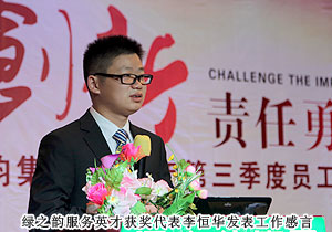 2012年10月16日,綠之韻集團(tuán)2012年第三季度員工大會暨“綠之韻五年服務(wù)英才”頒獎典禮在綠之韻國際大酒店隆重召開,綠之韻集團(tuán)高層領(lǐng)導(dǎo)、各分公司經(jīng)理、全體員工及湖南綠之韻保健日用品有限公司的員工代表出席會議。創(chuàng)新是企業(yè)發(fā)展的靈魂,是企業(yè)壯大的源動力,本次會議以“心創(chuàng)新、責(zé)任勇承”為主題,全面總結(jié)了第三季度的工作,并對下階段工作做出部署,爭取在2012年的最后沖刺階段用心創(chuàng)新,謀求更大的進(jìn)步,贏得更多的收獲。