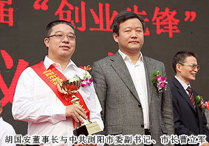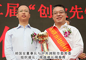 為表彰非公經(jīng)濟(jì)人士為瀏陽市經(jīng)濟(jì)社會發(fā)展做出的重要貢獻(xiàn),2012年10月13日上午,瀏陽市第四屆“優(yōu)秀中國特色社會主義事業(yè)建設(shè)者”頒獎(jiǎng)儀式在瀏陽市政東廣場隆重舉行。中共瀏陽市委副書記、市長曹立軍,長沙市政協(xié)副主席、市工商聯(lián)主席彭繼球等領(lǐng)導(dǎo)出席頒獎(jiǎng)儀式。會上,綠之韻集團(tuán)董事長胡國安被中共瀏陽市委、市政府授予第四屆“瀏陽市優(yōu)秀中國特色社會主義事業(yè)建設(shè)者”榮譽(yù)稱號。