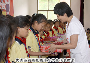 綠之韻集團(tuán)董事常務(wù)副總裁勞嘉、黨支部書(shū)記許達(dá)仲、慈善基金負(fù)責(zé)人蔣文,湖南地區(qū)優(yōu)秀經(jīng)銷(xiāo)商代表周書(shū)明、羅新春、夏曉玲等出席捐贈(zèng)儀式,用精美的圖書(shū)為孩子們打開(kāi)知識(shí)世界的一扇窗。