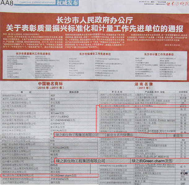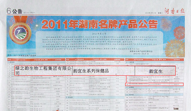 2012年4月10日,長沙市人民政府質(zhì)量工作會議成功召開。長沙市人民政府副市長何寄華,長沙市質(zhì)量監(jiān)督局局長陳曙光、副局長周笑春出席會議并發(fā)表重要講話。會上,綠之韻韻宜生系列產(chǎn)品榮獲“湖南名牌”榮譽稱號,是繼“韻宜生”商標(biāo)榮獲“湖南省著名商標(biāo)”后的又一重大榮譽。