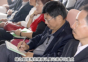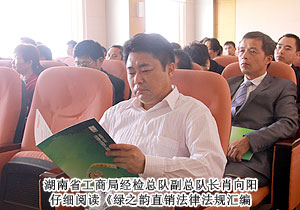 學(xué)習(xí)的過程中,綠之韻集團總裁助理兼企劃教育總監(jiān)何健就公司目前所展開的直銷法律法規(guī)學(xué)習(xí)研討會進行了介紹,并對湖南省工商部門一直以來“送法上門”的學(xué)習(xí)方式表示由衷的感謝。隨后,湖南省工商局經(jīng)檢總隊副總隊長肖向陽主持展開兩個《條例》學(xué)習(xí)專題講座,首先講述了兩個《條例》立法的意義,表明了政府打擊傳銷的態(tài)度,并對綠之韻集團及營銷人員一直以來配合國家兩個《條例》,規(guī)范經(jīng)營的行為進行了表揚。同時希望綠之韻營銷人員能繼續(xù)起好模范帶頭作用,促進直銷行業(yè)的健康發(fā)展。近兩個小時的學(xué)習(xí)結(jié)束后,在場的每一位經(jīng)銷商都感覺不虛此行,一名衡陽地區(qū)的經(jīng)銷商表示:“這次學(xué)習(xí)我收獲了很多,對直銷有了更深層次的認識,綠之韻是屬于我們大家的事業(yè),守護它的商譽我們責(zé)無旁貸,在今后的工作過程中我將更加嚴格貫徹國家相關(guān)法律政策,一如既往的自律經(jīng)營,為開創(chuàng)綠之韻的百年基業(yè)努力奮斗。”