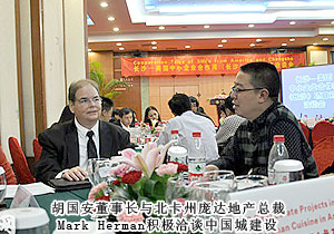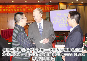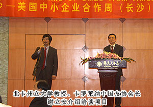 為落實(shí)周強(qiáng)書記在北京出席中美州長(zhǎng)對(duì)話會(huì)議關(guān)于“開創(chuàng)中美省州地方合作新未來(lái)”的精神,推進(jìn)湖南與北卡州簽訂的友好省州協(xié)議內(nèi)容,促進(jìn)湖南與北卡州全面開展民間經(jīng)濟(jì)外交,2011年10月20日下午,長(zhǎng)沙—美國(guó)中小企業(yè)合作周(長(zhǎng)沙)項(xiàng)目對(duì)接洽談會(huì)在華天大酒店召開,由卡羅萊納—中國(guó)友協(xié)董事會(huì)主席,北卡州議員,原美國(guó)農(nóng)業(yè)部副部長(zhǎng)Harris Blake為團(tuán)長(zhǎng)率領(lǐng)的美國(guó)北卡經(jīng)貿(mào)及友好交流訪問(wèn)團(tuán)成員來(lái)長(zhǎng)與長(zhǎng)沙企業(yè)家對(duì)接洽談。長(zhǎng)沙市政協(xié)副主席、市工商聯(lián)主席彭繼球,市僑聯(lián)副主席翁少蘭等領(lǐng)導(dǎo)出席了對(duì)接洽談。繼九月訪美赴北卡州考察與美方企業(yè)有過(guò)初步對(duì)接后,此次綠之韻集團(tuán)胡國(guó)安董事長(zhǎng)再次應(yīng)邀出席合作洽談會(huì)并對(duì)北卡州龐達(dá)地產(chǎn)總裁Mark Herman想建第一座中國(guó)城的項(xiàng)目積極關(guān)注。
