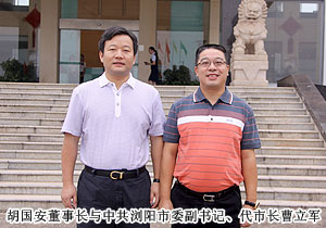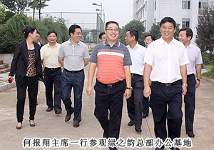 2011年9月8日上午,為更好地指導(dǎo)綠之韻集團(tuán)“萬企聯(lián)村,共同發(fā)展——湖南益陽萬畝中藥材種植基地”省級(jí)優(yōu)秀示范項(xiàng)目建設(shè),湖南省政協(xié)副主席、省工商聯(lián)主席何報(bào)翔在長沙市政協(xié)副主席、長沙市工商聯(lián)主席彭繼球,中共瀏陽市委副書記、代市長曹立軍等陪同下,蒞臨綠之韻集團(tuán)考察調(diào)研。同日下午,繼上次陪同何報(bào)翔主席前往郴州宜章考察縣域經(jīng)濟(jì)的發(fā)展,湖南省工商聯(lián)常委、綠之韻集團(tuán)董事長胡國安再次陪同何報(bào)翔主席前往瀏陽調(diào)研非公經(jīng)濟(jì)發(fā)展。