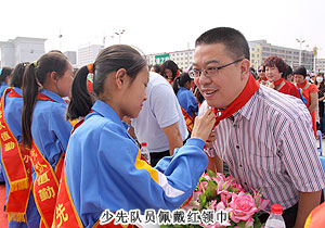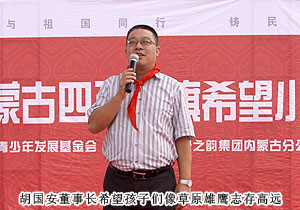 捐贈儀式現場,上百名綠之韻愛心精英共舞《中國人》,昂揚的氣勢,莊嚴的氛圍震撼全場。因為同是中國人,同在藍天下,所以我們更要像孟子所希望的一樣“老吾老以及人之老,幼吾幼以及人之幼”,奉獻自己力所能及的愛心,為社會輸送溫暖,讓感動在每一個人的心中升溫。少先隊員為蒞臨現場的領導和嘉賓敬獻紅領巾,那一抹鮮紅代表著光榮,代表著感恩,它在每一位愛心人士的胸前飄揚,讓綠之韻人的責任更加重大。四子王旗常委、常務副旗長蔚代青致歡迎辭,對綠之韻集團的大愛無疆表示誠摯的謝意和肯定。胡國安董事長發(fā)言,他表示:教育是立國之本,作為優(yōu)秀的企業(yè)公民,綠之韻始終堅持“企業(yè)做大了就是屬于國家、屬于社會的”這一社會責任理念,為捐建38所綠之韻希望小學的目標堅持不懈。草原是雄鷹的故鄉(xiāng),作為同樣從大山里走出來的孩子,胡國安董事長深深知道每一個孩子心中的夢想,希望孩子們能像鷹一樣,在學習中志存高遠,鷹擊長空。