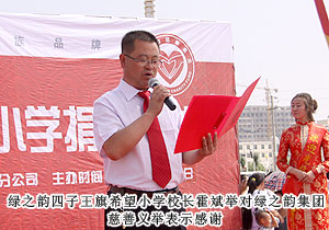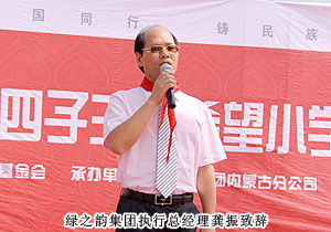 2011年7月20日,位于內蒙古自治區(qū)烏蘭察布市的四子王旗熱鬧非凡--綠之韻四子王旗希望小學在此舉行隆重的捐贈儀式。內蒙古自治區(qū)青少年發(fā)展基金會秘書長劉建忠、四子王旗旗委、常務副旗長蔚代青、政協(xié)副主席于有升、四子王旗工商局局長董明、副局長賈晉峰等政府領導及各界媒體嘉賓蒞臨,綠之韻集團董事長胡國安、執(zhí)行總經理龔振、綠之韻慈善基金總執(zhí)行戴曉彥不遠萬里趕赴捐贈現場,內蒙古分公司經理候立新、內蒙古地區(qū)愛心大使代表王連坤、郝建兵、張聞英以及2000余名綠之韻愛心大使參與愛心傳遞。