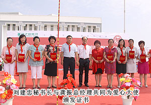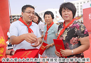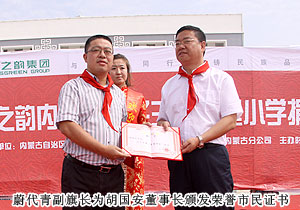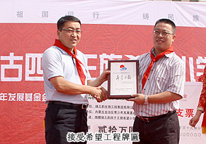 胡國安董事長向內蒙古自治區(qū)青基會秘書長劉建忠遞交二十萬捐贈支票,并接受希望工程牌匾。劉建忠秘書長發(fā)表講話,向勇于承擔社會責任的綠之韻集團和全體營銷精英致上誠摯敬意。四子王旗常委、常務副旗長蔚代青與胡國安董事長共同為希望小學揭牌,并向胡國安董事長頒發(fā)榮譽市民證書。青基會秘書長劉建忠和執(zhí)行總經理龔振給愛心經銷商頒發(fā)證書,整個活動現場人潮洶涌,彌漫著感恩與關愛,孩子們精彩的節(jié)目表演將揭牌儀式活動推向了高潮,現場所有精英心懷感動,愿意盡自己的能力獻出更多關愛和溫暖。龔總在致辭中說:在綠之韻八年的發(fā)展中,綠之韻慈善基金在教育、幫扶、救災、助學等方面作出的公益事業(yè)投入累計已近2000萬元,是每一位愛心綠之韻精英的點滴匯聚才有了公司萬涓成海的善舉。