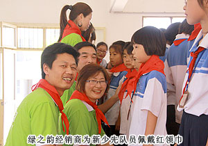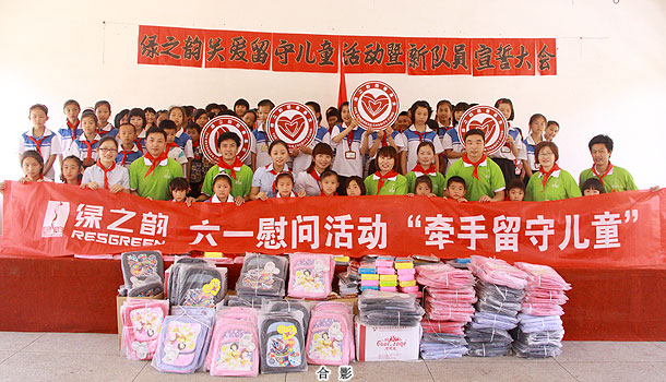 綠之韻集團秉承回饋社會的經營理念 ,在發(fā)展中勇于承擔社會責任,從2004年捐助第一所綠之韻老屋希望小學開始就為更多的農村孩子提供更多幫助。綠之韻集團一直也關注著留守兒童這一特殊群體,2011年5月30日,在六一國際兒童即將來臨的時候,綠之韻慈善基金總執(zhí)行戴曉彥號召湖南當?shù)氐膬?yōu)秀經銷商們?yōu)槔衔菹MW的孩子們送上了六一節(jié)的禮物。綠之韻集團董事常務副總裁勞嘉代表集團領導及員工慰問了綠之韻老屋希望小學的留守兒童,并發(fā)表了講話,鼓勵孩子們要努力學習,從小學會感恩社會、感恩學校和老師,樹立起遠大的理想,爭做祖國的棟梁之才。在慰問活動中,老屋希望小學還策劃了“紅領巾我為你自豪”的少先隊入隊儀式,綠之韻經銷商和員工代表一起參加了神圣而光榮的少先隊員入隊儀式,并榮幸的為新隊員佩戴紅領巾,祝愿新老隊員能相互幫助共同進步。綠之韻老屋希望小學的校長也為綠之韻長期以來關注教育關愛青少年兒童的成長表示了真摯的感謝。