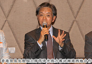 蘇澤光主席表示,最近,湖南在香港很“熱”,越來(lái)越多的港企來(lái)到湖南投資。香港貿(mào)發(fā)局將進(jìn)一步發(fā)揮窗口和橋梁作用,推動(dòng)湘港兩地在現(xiàn)代服務(wù)業(yè)、創(chuàng)意產(chǎn)業(yè)等領(lǐng)域深化合作,幫助湘企借助香港平臺(tái)走向世界。