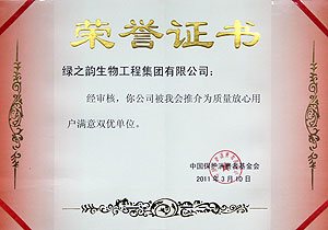 2011年“3?15”國(guó)際保護(hù)消費(fèi)者權(quán)益日之際,中國(guó)保護(hù)消費(fèi)者基金會(huì)根據(jù)《消費(fèi)者權(quán)益保護(hù)法》所賦予的職能和職責(zé),以“誠(chéng)信、維權(quán)”為年度消費(fèi)主題而組織的“全國(guó)市場(chǎng)放心消費(fèi)單位”評(píng)比活動(dòng)揭榜。綠之韻集團(tuán)認(rèn)真貫徹執(zhí)行《消費(fèi)者權(quán)益保護(hù)法》、《產(chǎn)品質(zhì)量法》,嚴(yán)格按照國(guó)家的行業(yè)規(guī)定與質(zhì)量標(biāo)準(zhǔn)組織生產(chǎn),經(jīng)過(guò)活動(dòng)組織方及國(guó)家相關(guān)部門的層層審查,被中國(guó)保護(hù)消費(fèi)者基金會(huì)授予“全國(guó)市場(chǎng)放心消費(fèi)單位”。
