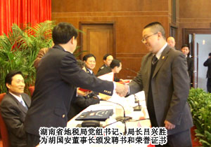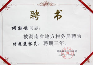 自2008年受聘湖南地稅局特邀監(jiān)查員以來,胡國安董事長認真履行職責,了解和反映基層稅務部門和稅務人員依法治稅、依法行政的情況,在解決群眾關心的熱點難點問題,促進行風政風建設方面取得了良好的效果,得到了地稅系統(tǒng)領導的一致好評。此次會議,胡國安董事長成唯一受聘連任湖南省地稅特邀監(jiān)察員的企業(yè)家。省地稅局黨組書記、局長呂興勝親自頒發(fā)了聘書和榮譽證書,并勉勵胡國安董事長認真履行職責,積極開展工作,進一步加大監(jiān)督力度,為我省黨風廉政建設、優(yōu)化經(jīng)濟發(fā)展環(huán)境作貢獻。