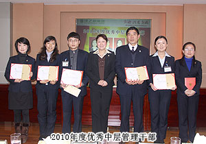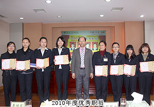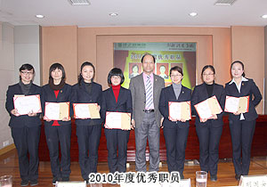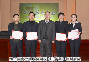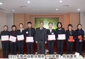 頒獎(jiǎng)典禮中,四季度服務(wù)明星、優(yōu)秀服務(wù)集體、年度優(yōu)秀職員、年度優(yōu)秀中層管理干部的表彰讓每一個(gè)員工感受到榮譽(yù)背后的忠誠(chéng)、敬業(yè)和專業(yè)。本次頒獎(jiǎng),一份得來不易的殊榮更讓員工們?yōu)閾碛芯G之韻的事業(yè)平臺(tái)而驕傲,為表彰鼓勵(lì)一直兢兢業(yè)業(yè),勤勤懇懇,愛司如家,對(duì)公司發(fā)展做出突出貢獻(xiàn)的優(yōu)秀員工,集團(tuán)特頒勞動(dòng)股份期權(quán)獎(jiǎng)。本次共有八名優(yōu)秀職員獲2011年度勞動(dòng)股份期權(quán)(五年期)特別嘉獎(jiǎng),四名優(yōu)秀職員獲2011年度勞動(dòng)股份期權(quán)(三年期)特別嘉獎(jiǎng)。胡國(guó)安董事長(zhǎng)親自為他們頒獎(jiǎng),并在總結(jié)發(fā)言中表示:或許你現(xiàn)在還離優(yōu)秀差一步,但只要你們?cè)倥Γ赂业叵騼?yōu)秀邁進(jìn),所有表現(xiàn)優(yōu)秀的職員都能在今后的努力中獲此殊榮。同時(shí),胡國(guó)安董事長(zhǎng)清晰地為員工們規(guī)劃職業(yè)生涯,讓綠之韻的每一位員工都能將才能最大化、價(jià)值最大化。