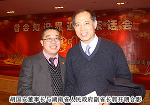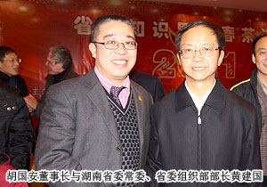 2011年1月5日,由湖南省委組織部、省委人才工作領(lǐng)導(dǎo)小組主辦、團(tuán)省委承辦的2011年度湖南省會(huì)知識(shí)界迎春茶話(huà)會(huì)在蓉園賓館舉行。湖南省委常委、省委組織部部長(zhǎng)、省委人才工作領(lǐng)導(dǎo)小組組長(zhǎng)黃建國(guó)、湖南省人大常委副主任肖雅瑜等省領(lǐng)導(dǎo)和省會(huì)各界在湘知識(shí)界的院士、專(zhuān)家學(xué)者代表歡聚一堂、暢敘友情、互致問(wèn)候、喜迎新春。茶話(huà)會(huì)由湖南省人民政府副省長(zhǎng)郭開(kāi)朗主持,綠之韻集團(tuán)董事長(zhǎng)胡國(guó)安作為榮獲湖南省人民政府一等功的湖南省優(yōu)秀青年企業(yè)家代表、省企業(yè)文化促進(jìn)協(xié)會(huì)副會(huì)長(zhǎng)應(yīng)邀出席,共話(huà)發(fā)展。