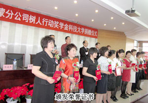 活動(dòng)現(xiàn)場(chǎng),綠之韻集團(tuán)執(zhí)行總經(jīng)理龔振先生致辭,鼓勵(lì)大學(xué)生們胸懷理想,好好學(xué)習(xí)、回饋社會(huì)、報(bào)效祖國(guó)。 隨后,綠之韻集團(tuán)向內(nèi)蒙古科技大學(xué)10位品學(xué)兼優(yōu)的寒門(mén)學(xué)子頒發(fā)《獎(jiǎng)學(xué)金證書(shū)》并每位捐贈(zèng)5000元款物。綠之韻集團(tuán)執(zhí)行總經(jīng)理龔振和學(xué)工部部長(zhǎng)王軍一同走上舞臺(tái),向王連坤、郝建兵、張聞?dòng)ⅰ埼挠ⅰ埣t菲、張雨菲、張聞華、周淑梅、劉美成、馬麗英十位綠之韻愛(ài)心分銷(xiāo)商代表頒發(fā)榮譽(yù)證書(shū)。學(xué)工部部長(zhǎng)王軍代表受捐助的學(xué)子以及校方對(duì)綠之韻樹(shù)人行動(dòng)的慷慨捐助表示衷心的感謝,充分肯定綠之韻企業(yè)以及分銷(xiāo)商們的善舉為家庭經(jīng)濟(jì)困難學(xué)生搭建了一座實(shí)現(xiàn)人生理想的橋梁,讓廣大學(xué)子深切感受到綠之韻人帶來(lái)的溫暖。綠之韻愛(ài)心代表郝建兵在致辭中說(shuō),內(nèi)蒙古地區(qū)的綠之韻人,時(shí)刻都沒(méi)有忘記用責(zé)任與愛(ài)心來(lái)幫助經(jīng)濟(jì)上困難的大學(xué)生。我堅(jiān)信受資助的學(xué)生一定會(huì)通過(guò)自己的努力,把自己鍛煉成一個(gè)有用的人,一個(gè)能夠回報(bào)社會(huì)的人,綠之韻人的愛(ài)心將持續(xù)撒播在內(nèi)蒙古的土地上,讓綠之韻人的“愛(ài)”得到永遠(yuǎn)的延續(xù)。