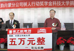 2010年5月24日,內(nèi)蒙古科技大學(xué)禮堂內(nèi)座無(wú)虛席,由綠之韻慈善基金聯(lián)合內(nèi)蒙古青少年基金會(huì)、內(nèi)蒙古科技大學(xué)主辦的“綠之韻樹(shù)人行動(dòng)”捐贈(zèng)儀式隆重舉行。這是綠之韻內(nèi)蒙古分公司成立一周年以來(lái),第二次在內(nèi)蒙古地區(qū)開(kāi)展“綠之韻樹(shù)人行動(dòng)”,以資助更多的貧困大學(xué)生完成學(xué)業(yè)。綠之韻集團(tuán)執(zhí)行總經(jīng)理龔振、內(nèi)蒙古分公司經(jīng)理侯立新、內(nèi)蒙古科技大學(xué)學(xué)工部部長(zhǎng)王軍、綠之韻集團(tuán)內(nèi)蒙古地區(qū)領(lǐng)導(dǎo)人王連坤、郝建兵等愛(ài)心精英代表、以及內(nèi)蒙古科技大學(xué)“綠之韻樹(shù)人行動(dòng)”獎(jiǎng)學(xué)金獲得者齊聚一堂,共同見(jiàn)證“綠之韻樹(shù)人行動(dòng)”在內(nèi)蒙古科技大學(xué)再啟愛(ài)心接力。