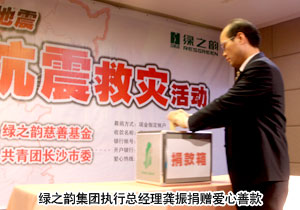 2010年4月18日,綠之韻集團(tuán)“情系玉樹(shù)?共筑家園”抗震救災(zāi)捐款活動(dòng)在綠之韻國(guó)際大酒店貴賓樓舉辦,聯(lián)合長(zhǎng)沙市青少年發(fā)展基金會(huì)向?yàn)?zāi)區(qū)捐贈(zèng)了第一筆愛(ài)心善款——30萬(wàn)元現(xiàn)金及物資。共青團(tuán)長(zhǎng)沙市委副書(shū)記彭勇、長(zhǎng)沙市青少年發(fā)展基金會(huì)秘書(shū)長(zhǎng)羊舒麟代表災(zāi)區(qū)現(xiàn)場(chǎng)接受捐贈(zèng)。長(zhǎng)沙市新聞?lì)l道、長(zhǎng)沙晚報(bào)等新聞媒體出席會(huì)議并現(xiàn)場(chǎng)報(bào)道捐款情況。綠之韻集團(tuán)董事常務(wù)副總經(jīng)理勞嘉、執(zhí)行總經(jīng)理龔振、市場(chǎng)總監(jiān)諶獻(xiàn)軍等集團(tuán)高管與集團(tuán)總部、國(guó)際大酒店、迪博制藥廠的員工代表、第二十九屆區(qū)域(高級(jí))經(jīng)理以及湖南地區(qū)分銷商代表現(xiàn)場(chǎng)踴躍捐款。胡國(guó)安董事長(zhǎng)雖身在異地,但仍通過(guò)總裁辦捐助愛(ài)心善款,并表達(dá)了對(duì)災(zāi)區(qū)同胞的關(guān)懷和鼓勵(lì)。
