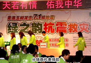 截止2010年4月18日15:00時(shí),綠之韻集團(tuán)現(xiàn)場(chǎng)共募得30772元愛(ài)心善款,與此同時(shí),全國(guó)各地綠之韻分銷商的愛(ài)心款項(xiàng)源源不斷匯入綠之韻慈善基金指定帳戶,捐款仍在繼續(xù)……