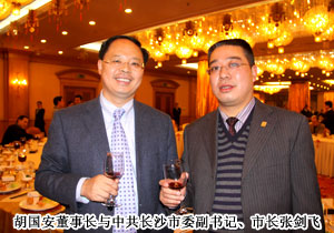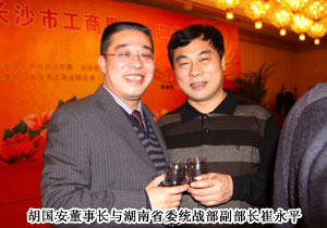 隨后,由中共長(zhǎng)沙市委、市人民政府主辦,長(zhǎng)沙市工商聯(lián)、市總商會(huì)承辦的“長(zhǎng)沙市工商界人士迎春酒會(huì)”在通程國(guó)際大酒店舉行,中共長(zhǎng)沙市委副書記、市人民政府市長(zhǎng)張劍飛主持酒會(huì)。中共湖南省委常委、長(zhǎng)沙市委書記陳潤(rùn)兒,省政協(xié)副主席、省工商聯(lián)主席何報(bào)翔等領(lǐng)導(dǎo)與來自省會(huì)長(zhǎng)沙工商界的500余名企業(yè)家歡聚一堂,共敘友誼,共謀發(fā)展。胡國(guó)安董事長(zhǎng)作為優(yōu)秀企業(yè)家、長(zhǎng)沙市工商聯(lián)(總商會(huì))副會(huì)長(zhǎng)向陳潤(rùn)兒書記以及張劍飛市長(zhǎng)等領(lǐng)導(dǎo)親切交流并匯報(bào)工作情況。