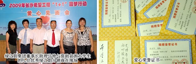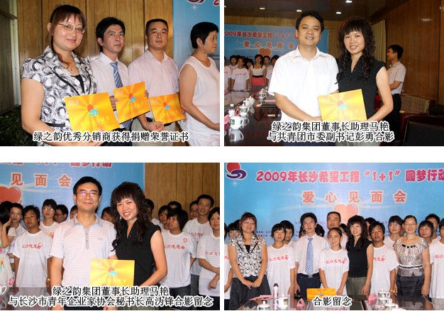 8月28日,湖南省長(zhǎng)沙市青少年宮內(nèi)洋溢著濃濃的愛(ài)心——在綠之韻慈善基金及綠之韻湖南分公司的組織下,以大學(xué)生影響小學(xué)生“綠之韻樹(shù)人行動(dòng)”全國(guó)第三站暨共青團(tuán)長(zhǎng)沙市委“2009長(zhǎng)沙希望工程圓夢(mèng)行動(dòng)”愛(ài)心見(jiàn)面會(huì)在此舉行。共青團(tuán)長(zhǎng)沙市委副書(shū)記彭勇、長(zhǎng)沙市青年企業(yè)家協(xié)會(huì)秘書(shū)長(zhǎng)高溈鋒、長(zhǎng)沙市青年聯(lián)合會(huì)副秘書(shū)長(zhǎng)楊溶、長(zhǎng)沙市青少年發(fā)展基金會(huì)副秘書(shū)長(zhǎng)羊舒麟等領(lǐng)導(dǎo),以及綠之韻集團(tuán)董事長(zhǎng)助理、慈善基金秘書(shū)長(zhǎng)馬艷、綠之韻愛(ài)心分銷商張建軍、黃翔、周書(shū)明、沈慧芳、李正元出席會(huì)議并捐贈(zèng)愛(ài)心款項(xiàng)。此次行動(dòng)以“一幫幾”的結(jié)對(duì)幫扶形式向近200名貧困準(zhǔn)大學(xué)生發(fā)放55萬(wàn)元助學(xué)款,用愛(ài)心托起了他們的大學(xué)夢(mèng)。綠之韻集團(tuán)利用樹(shù)人行動(dòng)的愛(ài)心力量共幫扶了七名考上清華、北大等名校卻無(wú)力承擔(dān)學(xué)費(fèi)的寒門學(xué)子。