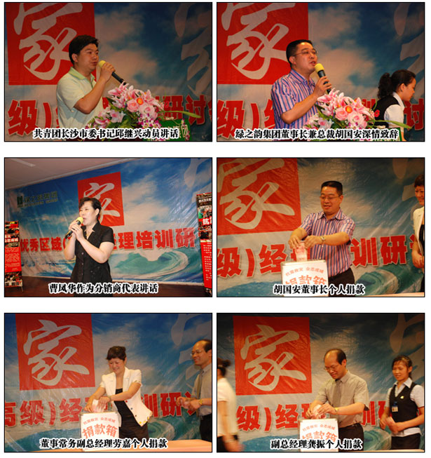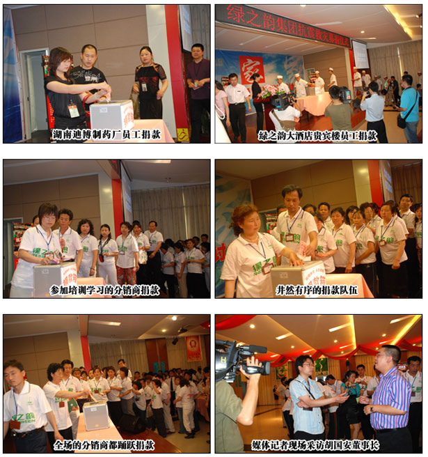 而綠之韻集團總部通過共青團長沙市委、長沙市青年企業(yè)家協會的聯絡與長沙市青少年發(fā)展基金會、長沙市血液中心組織現場捐款和義務獻血活動。17日下午13點30分,綠之韻“眾志成城 抗震救災”活動在綠之韻集團中國總部舉行,共青團長沙市委副書記、長沙市青年企業(yè)家協會常務副會長彭勇、長沙市青年企業(yè)家協會秘書長王海軍也蒞臨現場。隨后,由綠之韻集團董事長兼總裁胡國安向共青團長沙市委捐款100萬元現金及物資,而正在公司參加培訓學習的200余名分銷商、湖南綠之韻迪博制藥廠員工、綠之韻國際大酒店貴賓樓員工以及公司總部員工井然有序地排隊向災區(qū)捐款,現場募集現金138888元,共青團長沙市委當即將1138888元現金及物資轉交給長沙市青少年發(fā)展基金會。湖南電視臺、長沙電視臺、星辰在線網站等媒體記者對胡國安董事長進行了現場采訪,胡總說:“萬涓成水,匯愛成海。在中華民族遭遇災難的時刻,只要我們萬眾一心,眾志成城,共負國難,共渡難關,我們就一定能贏得抗震救災的最后勝利,一定能夠幫助災區(qū)人民重建美好的家園!”