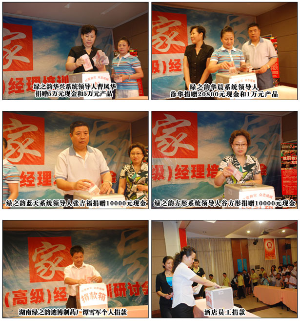 災情牽動著全國各地六千多家綠之韻分銷店以及數以萬計的綠之韻分銷員的心。災情發(fā)生后,綠之韻集團總部立即向下屬公司、全國各分公司、全國分銷店、分銷員發(fā)起募捐倡議,號召全體綠之韻人向災區(qū)人民伸出援助之手。得到了廣大分銷商及同仁的積極響應,踴躍獻出自己的一份愛心,綠之韻慈善基金源源不斷地收到來自全國各地不同地區(qū)分銷商的愛心捐款。