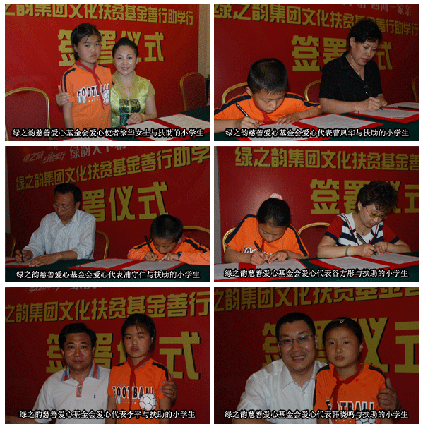 2007年5月19日晚上9:00,湖南長沙天璽大酒店四樓會議廳,綠之韻集團(tuán)公司領(lǐng)導(dǎo)及7位綠之韻慈善愛心基金會代表成員和來自貧困山區(qū)湘西古丈紅樹林小學(xué)的6名貧困家庭的小學(xué)生齊聚一堂,舉行綠之韻慈善愛心基金會善行認(rèn)領(lǐng)簽署儀式。綠之韻集團(tuán)董事常務(wù)副總經(jīng)理勞嘉女士為此次儀式致詞,綠之韻慈善愛心基金會愛心代表谷方彤女士及小學(xué)生代表彭艷琴分別做了感人至深的發(fā)言。