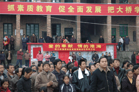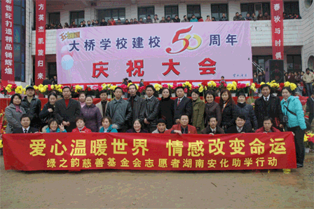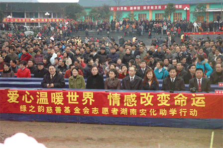 胡國安董事長代表綠之韻集團(tuán)出資十萬元捐助了第四所綠之韻大橋希望中學(xué),這也是綠之韻集團(tuán)公司繼2006年5月28日在黑龍江省佳木斯市捐助了第三所綠之韻珠山希望小學(xué)后的又一次慈善義舉。本次捐贈得到了當(dāng)?shù)馗咐相l(xiāng)親擁護(hù)的同時也得到湖南安化縣政府和教育局的高度贊譽,并授予胡國安集董事長為湖南安化冷市鎮(zhèn)大橋?qū)W校“榮譽校長”、安化縣“榮譽市民”的稱號。綠之韻優(yōu)秀經(jīng)銷商柳紅先、張吉福夫婦、李平、谷方彤、韓曉鳴以及綠之韻金航系統(tǒng)的部分代表作為綠之韻慈善基金會志愿者參加了此次活動。曹鳳華、柳紅先、張吉福夫婦、李平、谷方彤、廉淇夫婦、王愛麗、浦守仁夫婦、韓曉鳴、呂艷玲等人慷慨解囊,為大橋中學(xué)捐款,紛紛被安化縣政府授予“榮譽市民”稱號和大橋?qū)W校“愛心使者”的稱號。
