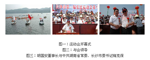 仲秋喜盼豐收日,盛世歡慶國慶時。2006年9月22日上午,由長沙市市委、長沙市人民政府主辦,綠之韻公司出資協(xié)辦的“長沙市第一屆農(nóng)民運(yùn)動會龍舟賽”在風(fēng)光秀美的瀏陽赤馬湖隆重開幕。湖南省常委、長沙市委書記梅克保、長沙市委巡視員、市人大黨組第一副書記余合泉、長沙市市委副書記吳志雄、長沙市市委秘書長張湘濤、長沙市人大副主任劉耀杰、長沙市人民政府副市長曹亞、長沙市政協(xié)副主席柳冠群、市政協(xié)副主席姚五零、瀏陽市委書記易佳良、綠之韻集團(tuán)董事長兼總裁胡國安先生與省市領(lǐng)導(dǎo)共同出席了第一屆農(nóng)民運(yùn)動會開幕式。
