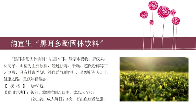 “黑耳多酚固體飲料”中的黑木耳能降低血黏度,清除體內(nèi)多余脂肪,降低膽固醇,減少血栓出現(xiàn)的可能,調(diào)整體內(nèi)微循環(huán),凈化血液,疏通血管從而預(yù)防心腦血管疾病的發(fā)生。山楂能顯著降低血清膽固醇及甘油三酯,有效防治動(dòng)脈粥樣硬化;山楂還有擴(kuò)張血管和持久降壓的作用。