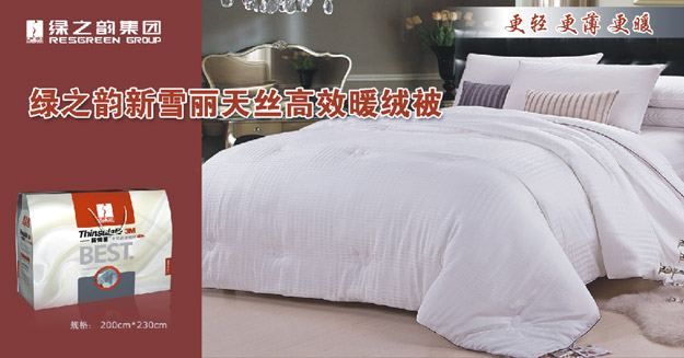 綠之韻集團與世界500強企業(yè)3M公司強強聯(lián)手推出高科技被芯——綠之韻新雪麗天絲高效暖絨被。此款被芯使用的是市場上熱重效率最高的合成保溫材料,利用被芯形成具有高吸附空氣性能的空間結構,從而阻止人體熱量通過空氣對流散失,同時反射回大部分的人體熱輻射,這樣就保障了人體熱量盡可能少的損失。且3M公司的新雪麗保溫材料就是為了可以承受地球上最苛刻的環(huán)境條件才研制出來的,因此從它誕生起就比一般的保溫材料更保暖。實驗證明,在相同重量的情況下,要多550克羽絨作為填充料,才能達到這樣一款新雪麗暖絨被的保暖效果,這也直接解決冬天蓋被臃腫的難題。