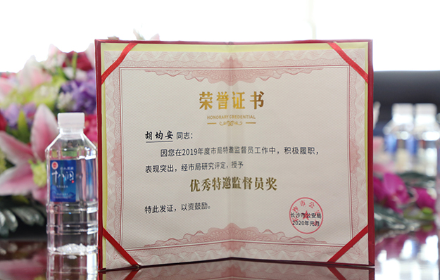 調(diào)研期間,長沙市公安局機關(guān)紀委副書記、知偵支隊黨委委員、副支隊長謝勝向特邀監(jiān)督員簡要匯報了2020年第一季度長沙市公安局主要工作:2020年是長沙公安的“社會治理創(chuàng)新年”“數(shù)據(jù)警務(wù)深化年”和“保障體系優(yōu)化年”,一季度市局工作主要圍繞“戰(zhàn)役情,保平安,體現(xiàn)長沙公安擔當;提能力,強隊伍,全面從嚴管黨治警;嚴打處,提服務(wù),維護社會治安穩(wěn)定”三個方面開展,取得了一定的成果。他表示,建立特邀監(jiān)督員制度是長沙公安機關(guān)以開放的姿態(tài)主動接受外部監(jiān)督的一項重要舉措,從這一年多時間的實踐來看,各位特邀監(jiān)督員能夠主動履職盡責(zé),積極建言獻策,充分發(fā)揮了群眾基礎(chǔ)好、業(yè)務(wù)水平高、實踐經(jīng)驗豐富等優(yōu)勢,從第三者的視角彌補了紀檢機關(guān)的監(jiān)督盲區(qū),為長沙公安隊伍建設(shè)提出了許多寶貴的意見建議。座談會上,市局機關(guān)紀委副書記、知偵支隊黨委委員、副支隊長謝勝向胡均安副總裁頒發(fā)了“優(yōu)秀特邀監(jiān)督員”榮譽證書。