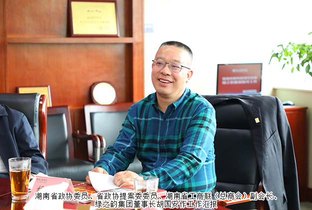 2020年3月26日,湖南省政協(xié)副主席張大方、省政協(xié)副秘書長(zhǎng)陳宏忠、省政協(xié)提案委主任袁海平、省政協(xié)人資環(huán)委主任李壯麗一行蒞臨綠之韻集團(tuán)調(diào)研指導(dǎo);瀏陽(yáng)經(jīng)開區(qū)黨工委委員、管委會(huì)副主任何六生陪同調(diào)研。湖南省政協(xié)委員、省政協(xié)提案委委員、湖南省工商聯(lián)(總商會(huì))副會(huì)長(zhǎng)、綠之韻集團(tuán)董事長(zhǎng)胡國(guó)安,湖南省工商聯(lián)女商會(huì)常務(wù)副會(huì)長(zhǎng)、瀏陽(yáng)市工商聯(lián)副主席、綠之韻集團(tuán)董事總裁勞嘉,副總裁胡均安,黨委書記劉云等公司領(lǐng)導(dǎo)全程陪同。