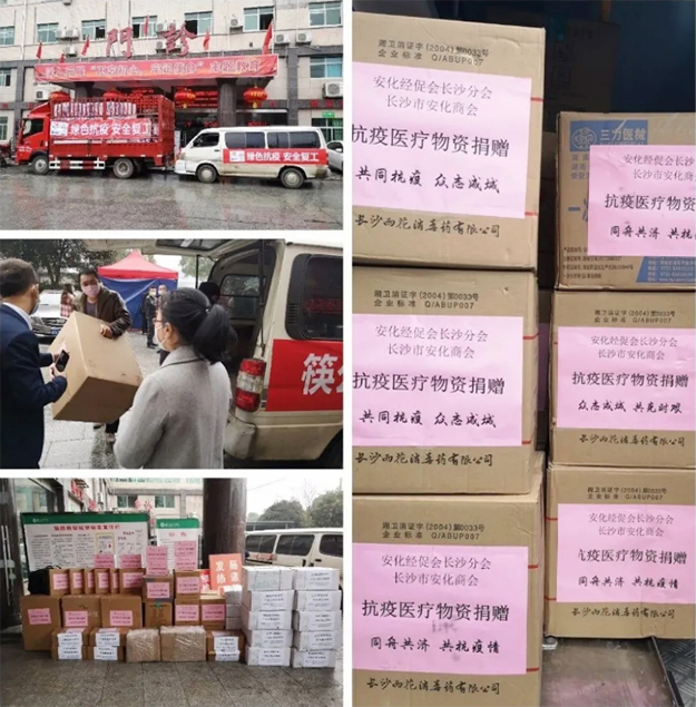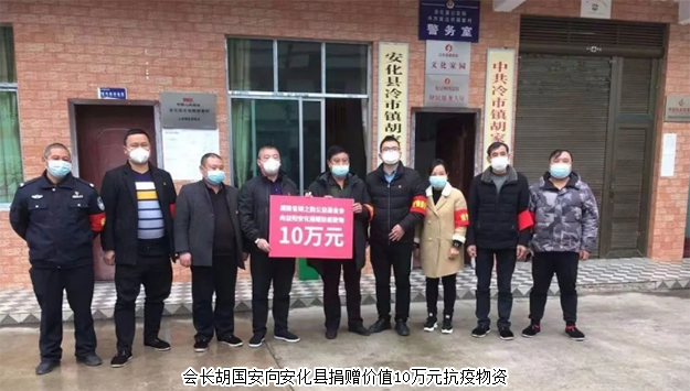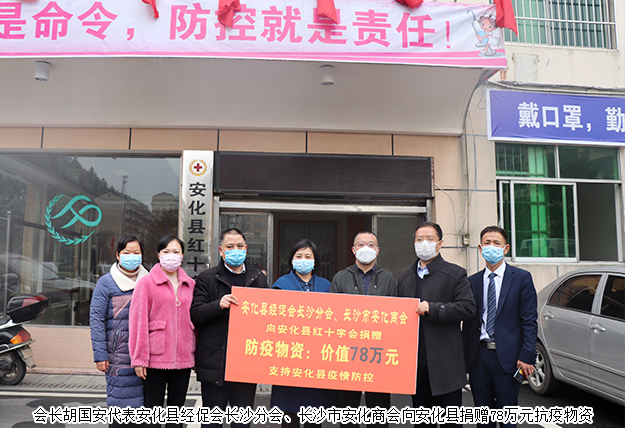 自疫情爆發(fā),安化縣經促會長沙分會、長沙市安化商會密切關注安化縣疫情發(fā)展,得知安化縣緊缺醫(yī)療防護物資,會長胡國安、執(zhí)行會長夏曉輝、常務副會長兼輪值會長吳余生等領導快速反應,積極作為,部署秘書處發(fā)動會員支援安化。1月30日,安化縣經促會長沙分會、長沙市安化商會向會員企業(yè)發(fā)起“支援安化抗擊疫情”的專項募捐活動,倡議各安商積極行動,支援安化,萬眾一心,抗擊疫情。倡議發(fā)出后,會員們積極響應,紛紛慷慨解囊,奉獻愛心,更有部分會員排除萬難,親自護送物資前往安化,以解安化燃眉之急。2月1日,會長胡國安捐贈價值10萬元的韓國KF口罩、醫(yī)用外科口罩、消毒液、洗護用品等醫(yī)療抗疫物資并親自護送至安化。