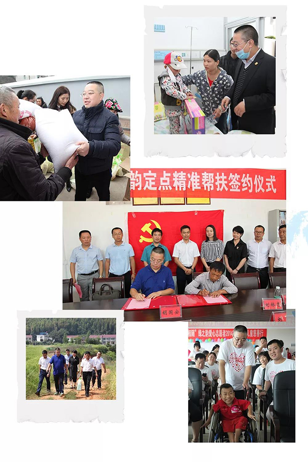 胡國(guó)安先生始終將企業(yè)社會(huì)責(zé)任戰(zhàn)略聚焦到企業(yè)與利益相關(guān)方共同發(fā)展的相關(guān)議題中,在對(duì)社會(huì)的回饋中釋放企業(yè)公益的價(jià)值,并在最能發(fā)揮綠之韻核心優(yōu)勢(shì)的領(lǐng)域,為行業(yè)、社會(huì)關(guān)注的希望工程、健康中國(guó)、社會(huì)養(yǎng)老和脫貧攻堅(jiān)等重要議題提供力量支撐。截止目前,綠之韻在胡國(guó)安先生的帶領(lǐng)下,已經(jīng)踴躍參與了100多項(xiàng)公益慈善項(xiàng)目,項(xiàng)目涉及希望學(xué)校、賑災(zāi)濟(jì)困、孤殘救助、醫(yī)療衛(wèi)生、修路飲水、社會(huì)養(yǎng)老等多個(gè)領(lǐng)域,公益足跡覆蓋全國(guó)13省60多個(gè)區(qū)縣,累計(jì)捐贈(zèng)款物達(dá)7000多萬(wàn)元。尤其是近年來(lái),綠之韻在胡國(guó)安先生的引領(lǐng)下,通過(guò)造血式產(chǎn)業(yè)扶貧、支援美麗鄉(xiāng)村建設(shè)等創(chuàng)新舉措,在瀏陽(yáng)市小河鄉(xiāng)、安化縣黃石片區(qū)、湘西龍山縣深入開(kāi)展精準(zhǔn)扶貧,贏得了社會(huì)各界的好評(píng)。胡國(guó)安先生先后被中央統(tǒng)戰(zhàn)部等五部委評(píng)為“全國(guó)優(yōu)秀中國(guó)特色社會(huì)主義事業(yè)建設(shè)者”、被中華慈善總會(huì)授予“突出貢獻(xiàn)獎(jiǎng)”、被共青團(tuán)中央授予“希望杰出貢獻(xiàn)獎(jiǎng)”,榮獲湖南省人民政府頒發(fā)的一等功、長(zhǎng)沙市人民政府頒發(fā)的二等功等榮譽(yù)表彰。“精準(zhǔn)扶貧”提出五周年之際,2018年10月16日綠之韻被全國(guó)工商聯(lián)、國(guó)務(wù)院扶貧辦評(píng)為全國(guó)“萬(wàn)企幫萬(wàn)村”精準(zhǔn)扶貧行動(dòng)先進(jìn)民營(yíng)企業(yè)。湖南政協(xié)云、《湘聲報(bào)》、湖南政協(xié)新聞網(wǎng)、新湖南等新聞媒體以《15年公益路,綠之韻的變與不變》為題,聚焦報(bào)道了綠之韻精準(zhǔn)扶貧、助力攻堅(jiān)的創(chuàng)新實(shí)踐歷程。