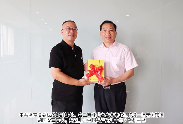 為迎接即將到來的70周年祖國華誕,9月25日下午,中共湖南省委統(tǒng)戰(zhàn)部副部長、省工商業(yè)聯(lián)合會黨組書記陳瀟一行走訪慰問“第四屆全國優(yōu)秀中國特色社會主義事業(yè)建設(shè)者”胡國安董事長,為胡國安董事長送來鮮花與《中國共產(chǎn)黨九十年》系列叢書,對胡國安董事長一直以來支持統(tǒng)一戰(zhàn)線工作、為湖南社會經(jīng)濟發(fā)展作貢獻表示感謝并送上節(jié)日的祝福。