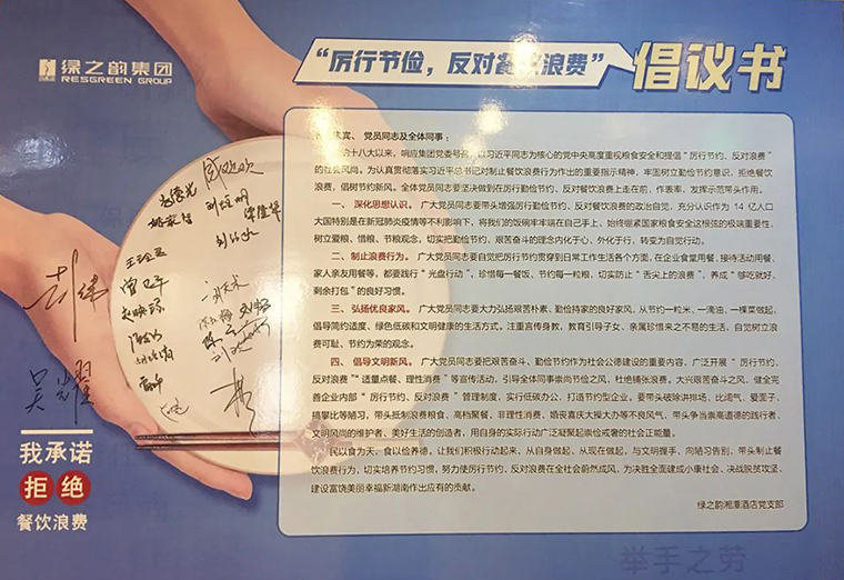 9月7日-10日,綠之韻集團(tuán)黨委下屬國(guó)際大酒店支部、湘潭酒店支部、保健日用品支部紛紛響應(yīng),組織員工簽署“光盤行動(dòng)”倡議書,在全公司上下掀起了厲行節(jié)約的良好氛圍。