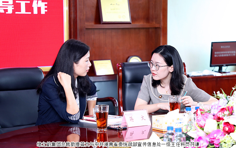 2020年9月16日,中共湖南省委統(tǒng)戰(zhàn)部宣傳信息處處長李蓉、副處長馮小明、一級主任科員符謙一行蒞臨綠之韻集團調(diào)研指導(dǎo)。綠之韻集團董事、總裁勞嘉,總裁助理蔣文陪同調(diào)研。