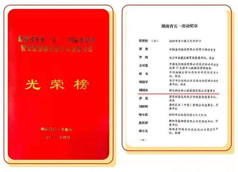 2021年4月29日上午,湖南省慶祝“五一”國際勞動節(jié)暨先進(jìn)集體先進(jìn)個人表彰大會在長沙召開。中共湖南省委書記、省人大常委會主任許達(dá)哲,省委副書記、省長毛偉明,省領(lǐng)導(dǎo)謝建輝、張劍飛、馮毅、吳桂英、周農(nóng)、陳飛出席。綠之韻集團(tuán)董事長胡國安參加會議,并被光榮授予“湖南省五一勞動獎?wù)隆睒s譽(yù)。
