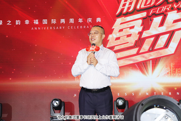 會(huì)議最后,在現(xiàn)場(chǎng)最為熱烈的掌聲中,綠之韻集團(tuán)董事長(zhǎng)胡國(guó)安上臺(tái)講話。他首先向大會(huì)現(xiàn)場(chǎng)以及通過在線互動(dòng)視頻觀看本次周年慶典的綠之韻家人致以熱烈的歡迎和誠(chéng)摯的問候,并向每一位獲獎(jiǎng)?wù)弑硎緹崃业淖YR。他說道,我是綠之韻代言人胡國(guó)安,也是你們的幸福代言人。今年的7月1日,我們即將迎來偉大的中國(guó)共產(chǎn)黨100周年誕辰。百年來,因?yàn)檠影簿瘛⒕畬骄瘛⒖挂呔瘛⒖拐鹁竦纫幌盗袃?yōu)秀的傳承精神為中國(guó)共產(chǎn)黨的繁榮、發(fā)展和壯大注入了源源不斷的新動(dòng)能。在綠之韻幸福國(guó)際兩周年之際,我十分欣慰,看到如此多優(yōu)秀的幸福代言人獲得了屬于自己的榮譽(yù),看到臺(tái)前幕后許許多多幸福國(guó)際領(lǐng)導(dǎo)人忙碌的身影,從你們身上看到了那種優(yōu)秀的精神,我為你們點(diǎn)贊!未來,在綠之韻事業(yè)的發(fā)展路上,在幸福國(guó)際的路上,在奔向幸福的道路上,有你,有我,有我們。我相信,各位幸福代言人將在綠之韻集團(tuán)執(zhí)行總經(jīng)理夏運(yùn)良的領(lǐng)導(dǎo)下取得更大的突破。我更欣慰的看到你們?cè)谑袌?chǎng)發(fā)展的過程中,始終堅(jiān)持“以產(chǎn)品為導(dǎo)向”發(fā)展理念,致力于傳承中華五千年養(yǎng)生文化,堅(jiān)持走中國(guó)的大健康之路,堅(jiān)持把支部扎根在連隊(duì)上,培養(yǎng)各類優(yōu)秀骨干。真心的祝愿現(xiàn)場(chǎng)的每一位幸福代言人,希望你們?cè)谖磥砭G之韻幸福國(guó)際的3周年、5周年乃至10周年的頒獎(jiǎng)盛典上,都能成為家族的驕傲、同事學(xué)習(xí)的榜樣,公司的骨干,國(guó)家的棟梁。讓我們一起奔跑在幸福的道路上。