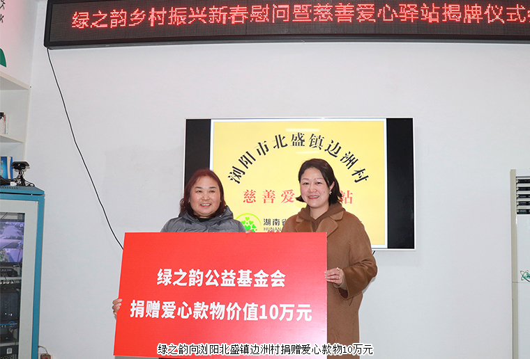 春節(jié)慰問(wèn)送溫暖,暖冬關(guān)愛顯真情。2022年1月13日,綠之韻鄉(xiāng)村振興建設(shè)暨新春慰問(wèn)活動(dòng)走進(jìn)瀏陽(yáng)北盛鎮(zhèn)邊洲村。綠之韻再次向邊洲村捐贈(zèng)10萬(wàn)元愛心款物,主要用于邊洲村鄉(xiāng)村振興建設(shè)和困難群眾新春慰問(wèn)等,并與村委共建慈善愛心驛站,希望影響更多的愛心企業(yè)和人士來(lái)到愛心驛站奉獻(xiàn)愛心,輸送溫暖。