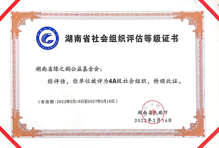2022年3月9日,湖南省社會(huì)組織等級(jí)評(píng)估授牌大會(huì)在長(zhǎng)沙召開(kāi)。根據(jù)民政部《社會(huì)組織評(píng)估管理辦法》、《湖南省社會(huì)組織評(píng)估管理辦法》有關(guān)規(guī)定,社會(huì)組織等級(jí)評(píng)估從基礎(chǔ)條件、內(nèi)部治理、工作績(jī)效、黨建工作和社會(huì)評(píng)價(jià)五個(gè)方面對(duì)申報(bào)單位進(jìn)行綜合考評(píng),經(jīng)專家組實(shí)地考察、現(xiàn)場(chǎng)交流、意見(jiàn)反饋、資料核查、網(wǎng)上公示等程序,最終確定評(píng)估等級(jí)。湖南省綠之韻公益基金會(huì)獲評(píng)“4A級(jí)社會(huì)組織”。