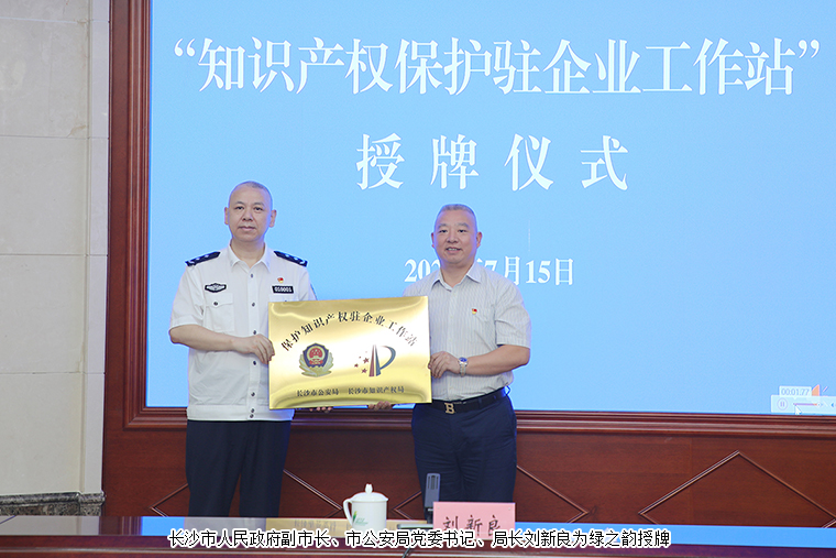 2022年7月15日,“知識產(chǎn)權(quán)保護(hù)駐企業(yè)工作站”授牌儀式在瀏陽經(jīng)開區(qū)舉行。長沙市人民政府副市長、市公安局黨委書記、局長劉新良,長沙市人民政府副秘書長譚海,長沙市公安局黨委委員、副局長彭遲平,瀏陽經(jīng)開區(qū)(高新區(qū))黨工委委員、管委會副主任唐建國,瀏陽市人民政府副市長、市公安局局長劉一斌以及長沙市公安局、長沙市知識產(chǎn)權(quán)局、瀏陽經(jīng)開區(qū)、瀏陽市市場監(jiān)督管理局、長沙市公安局知偵支隊(duì)等單位分管領(lǐng)導(dǎo)和部門負(fù)責(zé)人參加會議。長沙市公安局特邀監(jiān)督員、綠之韻集團(tuán)副總裁胡均安受邀參加會議。
