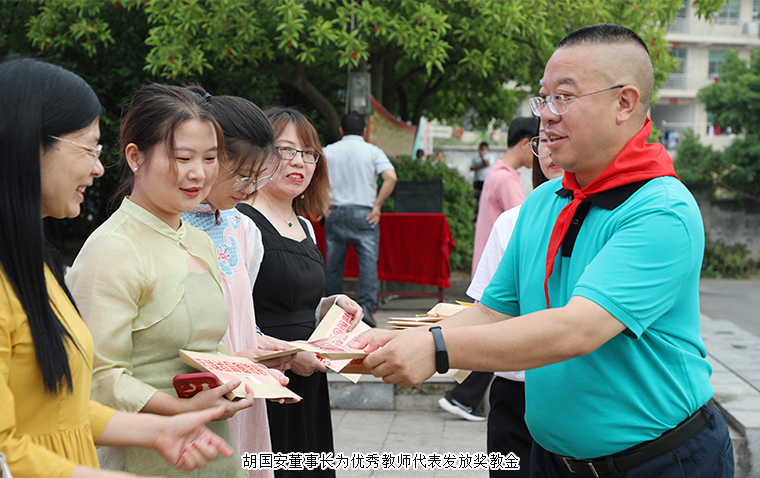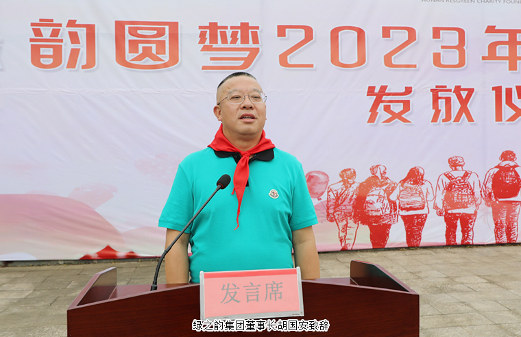 “時(shí)隔幾十年,今天我再次光榮的戴上鮮艷的紅領(lǐng)巾,心情很激動(dòng),有了不一樣的認(rèn)知,此時(shí)的身份不再是學(xué)生,更多的是一份責(zé)任和擔(dān)當(dāng)。”綠之韻集團(tuán)董事長(zhǎng)胡國(guó)安深情地說(shuō),今天看到這么多優(yōu)秀的老師、學(xué)生代表,仿佛回到了兒時(shí),那個(gè)從安化大山里走出的小孩闖南走北最終回到故鄉(xiāng),有機(jī)會(huì)回報(bào)家鄉(xiāng),回報(bào)父母,回報(bào)母校,這是一件多么的幸福和榮耀的事情。他表示,少年強(qiáng)則國(guó)強(qiáng),青少年是祖國(guó)的希望與未來(lái)。教育幫扶一直是綠之韻公益基金會(huì)的重要關(guān)注點(diǎn)之一。今天在安化大橋?qū)W校設(shè)立專項(xiàng)獎(jiǎng)學(xué)金,給予那些品學(xué)兼優(yōu)的學(xué)生和辛苦耕耘的老師更多鼓勵(lì)和學(xué)習(xí)的機(jī)會(huì),希望獲得鼓勵(lì)的優(yōu)秀師生代表可以堅(jiān)定理想信念,樹(shù)立遠(yuǎn)大抱負(fù),把這份殷殷愛(ài)心轉(zhuǎn)化為成才之志、奮發(fā)之源,在建設(shè)家鄉(xiāng)、投身鄉(xiāng)村振興、回報(bào)國(guó)家的生動(dòng)實(shí)踐中放飛青春夢(mèng)想。捐資助學(xué)是一份愛(ài)心,回報(bào)桑梓是一份鄉(xiāng)情,返鄉(xiāng)創(chuàng)業(yè)是一種責(zé)任。今天在現(xiàn)場(chǎng)所有的老師、同學(xué)們也是未來(lái)安化的人才和棟梁,他希望每一個(gè)走出安化的人都可以不忘家鄉(xiāng)養(yǎng)育之恩,大力支持家鄉(xiāng)各項(xiàng)事業(yè)發(fā)展,為建設(shè)新時(shí)代高質(zhì)量、富饒美麗的安化貢獻(xiàn)一份力量。