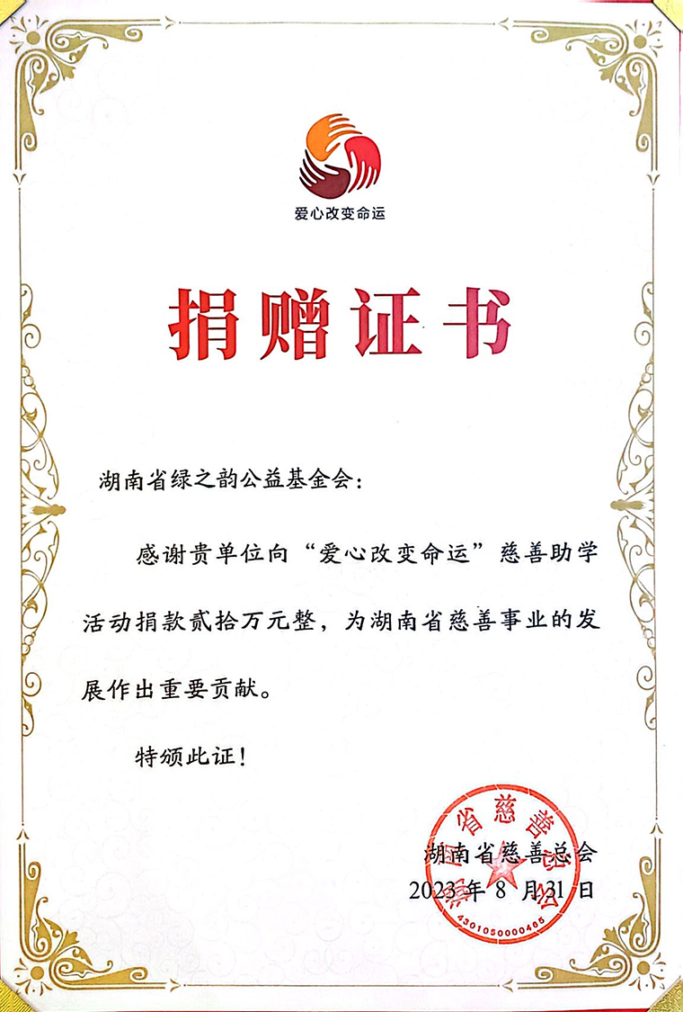20年來(lái),綠之韻集團(tuán)在振興實(shí)業(yè)的同時(shí),積極承擔(dān)企業(yè)公民責(zé)任,踴躍參與了100多項(xiàng)社會(huì)公益項(xiàng)目,先后捐贈(zèng)了11所希望學(xué)校,開(kāi)展了“樹(shù)人行動(dòng)”“綠韻圓夢(mèng)·書(shū)香助學(xué)”“綠+兒童關(guān)愛(ài)”“愛(ài)心助學(xué)圓夢(mèng)計(jì)劃”等一系列慈善公益活動(dòng),累計(jì)捐款捐物達(dá)7600多萬(wàn)元。2015年夏天,綠之韻攜手湖南經(jīng)視助力“寒門(mén)學(xué)子圓夢(mèng)”行動(dòng)走進(jìn)長(zhǎng)沙縣、望城、寧鄉(xiāng)、新化、益陽(yáng)等地,胡國(guó)安董事長(zhǎng)、勞嘉理事長(zhǎng)以及愛(ài)心志愿者們?yōu)榭忌洗髮W(xué)卻家庭困難的學(xué)生送去助學(xué)金。今年,綠之韻再次捐資20萬(wàn)元,攜手湖南省慈善總會(huì)繼續(xù)開(kāi)展“愛(ài)心改變命運(yùn)”慈善助學(xué)活動(dòng)走進(jìn)常德、安化、新化等地,助力勵(lì)志學(xué)子圓夢(mèng)大學(xué)。溫暖開(kāi)學(xué)季,一封封飛往湖湘大地的大學(xué)錄取通知書(shū),給學(xué)子們描繪著新的希望;而“愛(ài)心改變命運(yùn)”項(xiàng)目集結(jié)的助學(xué)金款項(xiàng),為勵(lì)志學(xué)子們更添了一份向上攀登的底氣。未來(lái),綠之韻集團(tuán)將繼續(xù)參與愛(ài)心助學(xué)活動(dòng),影響和帶動(dòng)更多的熱心人士和愛(ài)心企業(yè)加入到公益行列中來(lái),為需要幫助的人送去更多溫暖和力量!