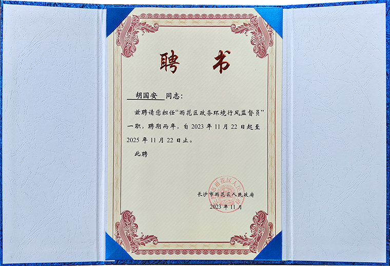 監(jiān)督工作是規(guī)范政務(wù)服務(wù)工作的“度量尺”,是監(jiān)督營(yíng)商環(huán)境的“探照燈”,是密切干群關(guān)系的“連心橋”。胡國(guó)安董事長(zhǎng)表示,此次受聘為長(zhǎng)沙市雨花區(qū)政務(wù)環(huán)境行風(fēng)監(jiān)督員,是雨花區(qū)政府一直以來(lái)優(yōu)化營(yíng)商環(huán)境、打造親切政企關(guān)系的體現(xiàn),能夠擔(dān)任政務(wù)監(jiān)督員是一種榮譽(yù),更是一份責(zé)任,今后不僅要積極建言獻(xiàn)策,及時(shí)收集和反映企情民意,也會(huì)積極參與雨花區(qū)政務(wù)服務(wù)改革和政策宣傳解讀,成為密切干群關(guān)系的橋梁和紐帶,將以高度的責(zé)任感和使命感,認(rèn)真履行職責(zé),發(fā)揮自身特長(zhǎng)和優(yōu)勢(shì),把握新動(dòng)向、洞察新問(wèn)題,同心協(xié)力為長(zhǎng)沙市雨花區(qū)高質(zhì)量發(fā)展作出積極貢獻(xiàn)。