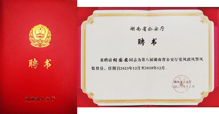 再次被受聘為湖南省公安廳黨風(fēng)政風(fēng)警風(fēng)監(jiān)督員,胡國安董事長深感責(zé)任重大。他表示,一直以來,他對監(jiān)督員的身份始終葆有一種神圣的使命感和責(zé)任感。這份聘書是沉甸甸的,不僅是一種光榮,更肩負(fù)著廣大普通民眾的矚托。未來,他一定不辜負(fù)湖南省公安廳黨委的期望,不辜負(fù)廣大民眾的重托,依法依規(guī)行使監(jiān)督員的職責(zé),當(dāng)好人民的“調(diào)研員”,深入調(diào)研了解廣大群眾對公安工作的意見和建議;當(dāng)好人民的“查糾員”,行使好監(jiān)督員的群眾監(jiān)督作用;當(dāng)好人民的“參謀員”,向公安機關(guān)傳送群眾的呼聲和期盼、積極建言獻(xiàn)策;當(dāng)好人民的“宣傳員”,幫助講好警察故事,積極引導(dǎo)社會各界理解、支持公安工作,為形成人人遵法守法、自覺配合執(zhí)法的良好社會氛圍,助力全省公安工作現(xiàn)代化貢獻(xiàn)出自己的一份力量。