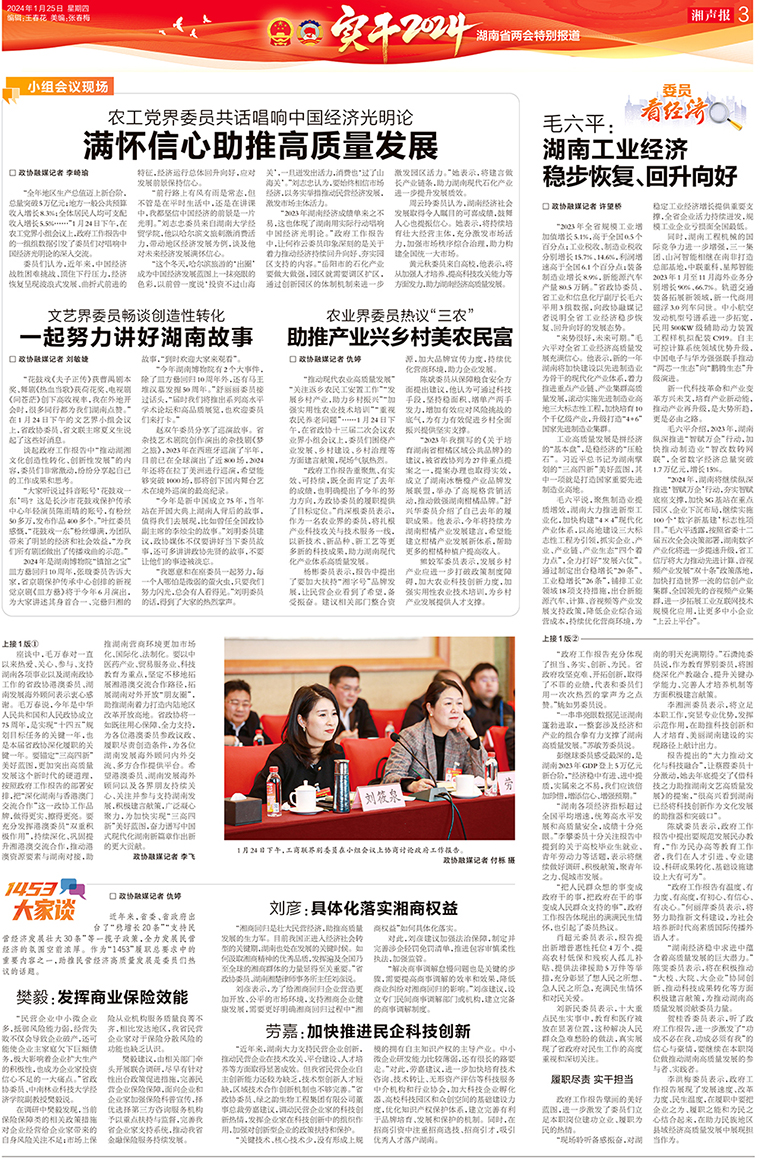 號角激越,催人奮進。勞嘉委員認為,報告總結(jié)的成績鼓舞人心,所描繪的藍圖催人奮進,政協(xié)工作確實落在了“協(xié)”,干在了“實”,有方向、有重點、有合力、有激情、有章法、有實效。尤其是十三屆常委會制定的“1453”履職總要求,讓委員們學(xué)會緊扣“國之大者”“省之大計”“民之關(guān)切”切實履職。作為一名扎根湖南二十年的企業(yè)家,特別對報告中提出的2024年要“在助推民營經(jīng)濟高質(zhì)量發(fā)展上彰顯新作為,圍繞優(yōu)化法治化營商環(huán)境、促進民營經(jīng)濟發(fā)展政策落實情況開展民主監(jiān)督,助推惠企政策落實落地”“在深化湘港澳交流合作上邁出新步伐,促進湘港澳中醫(yī)藥產(chǎn)業(yè)優(yōu)勢互補、協(xié)同發(fā)展,促進服務(wù)貿(mào)易、科技教育等領(lǐng)域交流合作,助推湖南全面融入粵港澳大灣區(qū)國家戰(zhàn)略”等工作部署,充滿期待,時刻準備。在接下來的工作中,將懷著高度的使命感和強烈的責(zé)任感,充分發(fā)揮好政協(xié)委員的示范引領(lǐng)作用,做實本職實體,加快創(chuàng)新升級,為實現(xiàn)“三高四新”美好藍圖、建設(shè)社會主義現(xiàn)代化新湖南貢獻智慧和力量。