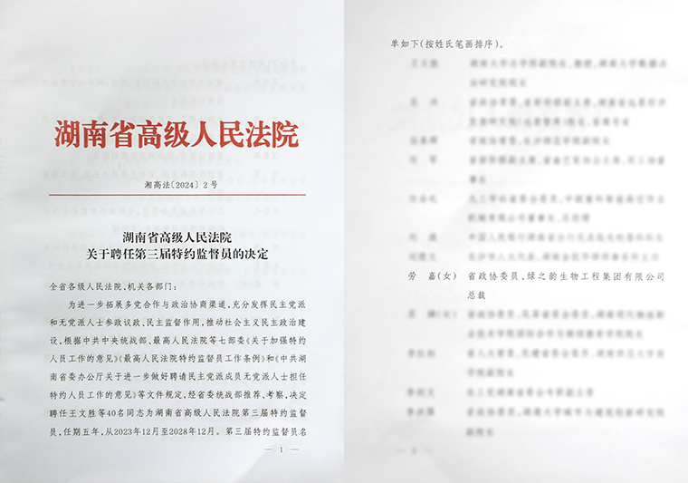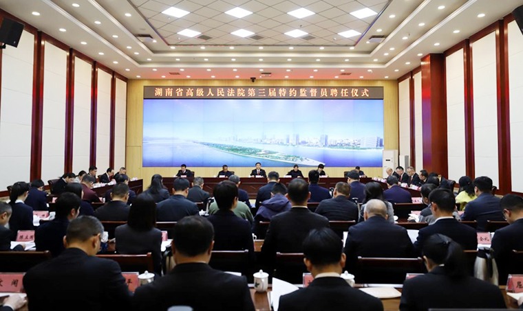 2024年3月21日,湖南省高級(jí)人民法院舉行第三屆特約監(jiān)督員聘任儀式。湖南省高級(jí)人民法院黨組書(shū)記、院長(zhǎng)朱玉出席會(huì)議并講話,為特約監(jiān)督員代表頒發(fā)聘書(shū)。湖南省高級(jí)人民法院黨組副書(shū)記、副院長(zhǎng)鄔文生主持會(huì)議。中共湖南省委統(tǒng)戰(zhàn)部副部長(zhǎng)廖建華出席會(huì)議并講話。中共湖南省委政法委二級(jí)巡視員羅壽初,省人大監(jiān)察和司法委員會(huì)副主任委員段成鋼,省政協(xié)社會(huì)和法制委員會(huì)駐會(huì)副主任楊天兵出席會(huì)議。湖南省高級(jí)人民法院黨組成員、政治部主任李知文宣讀聘任決定。湖南省政協(xié)委員、綠之韻集團(tuán)總裁勞嘉等40名同志被聘為湖南省高級(jí)人民法院第三屆特約監(jiān)督員。