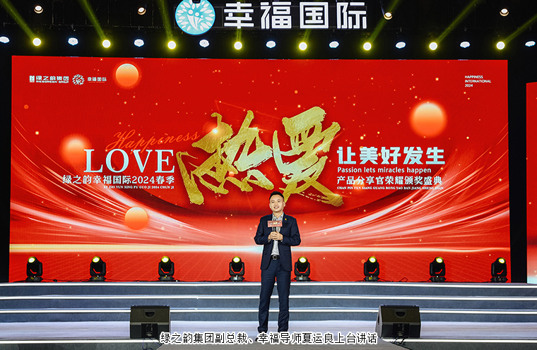 在活動(dòng)接近尾聲之時(shí),綠之韻集團(tuán)副總裁、幸福導(dǎo)師夏運(yùn)良上臺(tái)講話。他向大會(huì)現(xiàn)場以及通過直播互動(dòng)視頻觀看本次大會(huì)盛況的綠之韻幸福國際家人們致以熱烈的歡迎和誠摯的問候,并向每一位獲獎(jiǎng)?wù)弑硎緹崃业淖YR。他表示,今天大會(huì)的主題是熱愛,讓美好發(fā)生。今天站在舞臺(tái)的將近900位產(chǎn)品分享官、每一位戰(zhàn)隊(duì)長和戰(zhàn)隊(duì)代表、所有分享者,以及全新亮相的五大市場的核心管理團(tuán)隊(duì)已經(jīng)很好地詮釋了這個(gè)主題,在2024年第一季度的戰(zhàn)斗中,你們用熱愛創(chuàng)造了一個(gè)美好的奇跡。什么是熱愛?一個(gè)真正熱愛事業(yè)的人,他們會(huì)有強(qiáng)大的內(nèi)在動(dòng)力;會(huì)有超強(qiáng)的抗壓能力;他們有著高效的時(shí)間管理和效率;他們善于創(chuàng)造勇于承擔(dān);他們自身有滿滿的成就感和幸福感。熱愛是綠之韻幸福國際能一直走上坡路的燈塔。從綠之韻幸福國際成立那一天起,科技讓中醫(yī)養(yǎng)生進(jìn)萬家,就是我們奮斗的燈塔。因?yàn)闊釔郏覀儌鞒泻蛣?chuàng)新老祖宗的中醫(yī)智慧,做一款讓世界更美好的產(chǎn)品,幫助更多人收獲健康;因?yàn)闊釔郏覀冏屝腋H成為一個(gè)長久、安全、穩(wěn)健的創(chuàng)業(yè)平臺(tái),讓幸福代言人能夠擁有低門檻就業(yè)、創(chuàng)業(yè)的機(jī)會(huì);因?yàn)闊釔郏覀儠?huì)努力,成為一群靠譜的人,讓美好在對的時(shí)間都能如約而至。感謝每一位熱愛著產(chǎn)品、熱愛著綠之韻幸福國際的你們,我會(huì)竭盡全力,為你們的熱愛保駕護(hù)航!