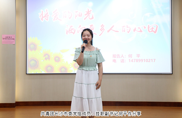隨后,共青團長沙市委黨組成員、掛職副書記何平,以自身經(jīng)歷為例,為大家分享了她的勵志故事。參加工作之后,她長期致力于青少年公益事業(yè),先后在39所少年宮和學(xué)校開設(shè)了“向日葵姐姐·心靈熱線”等服務(wù),六七年來,共接到聽眾來電1300多人次,回復(fù)郵件和信件4000多封,QQ訪問量達50多萬人,先后資助了70余位貧困學(xué)生。雖然生活給予了她比常人更多的磨難,但她用自己的親身經(jīng)歷鼓勵大家,要保持陽光的心態(tài),伸出愛的雙手,把愛灑向更多人的心田。